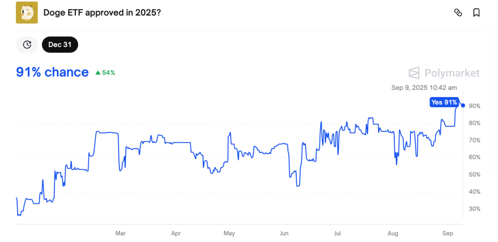 Pour l’heure, l’excitation sur les marchés dérivés est aussi à son paroxysme. En effet, Polymarket indique que les parieurs évaluent à 91 % la probabilité d’un ETF spot DOGE d’ici fin 2025. Par ailleurs, la SEC devra se prononcer mi-octobre sur la conversion du Dogecoin Trust de Grayscale en ETF.