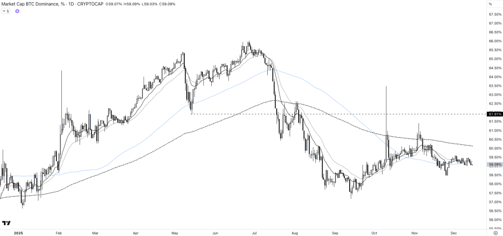 À ce jour, les graphiques démontrent que la dominance oscille autour des 57 % et 60 % depuis le mois de septembre. Autrement dit : la domination ne grimpe plus en ligne droite, mais elle reste haute, cela signifiant une préférence tenace des investisseurs pour l’actif le plus liquide du marché plutôt que les altcoins.