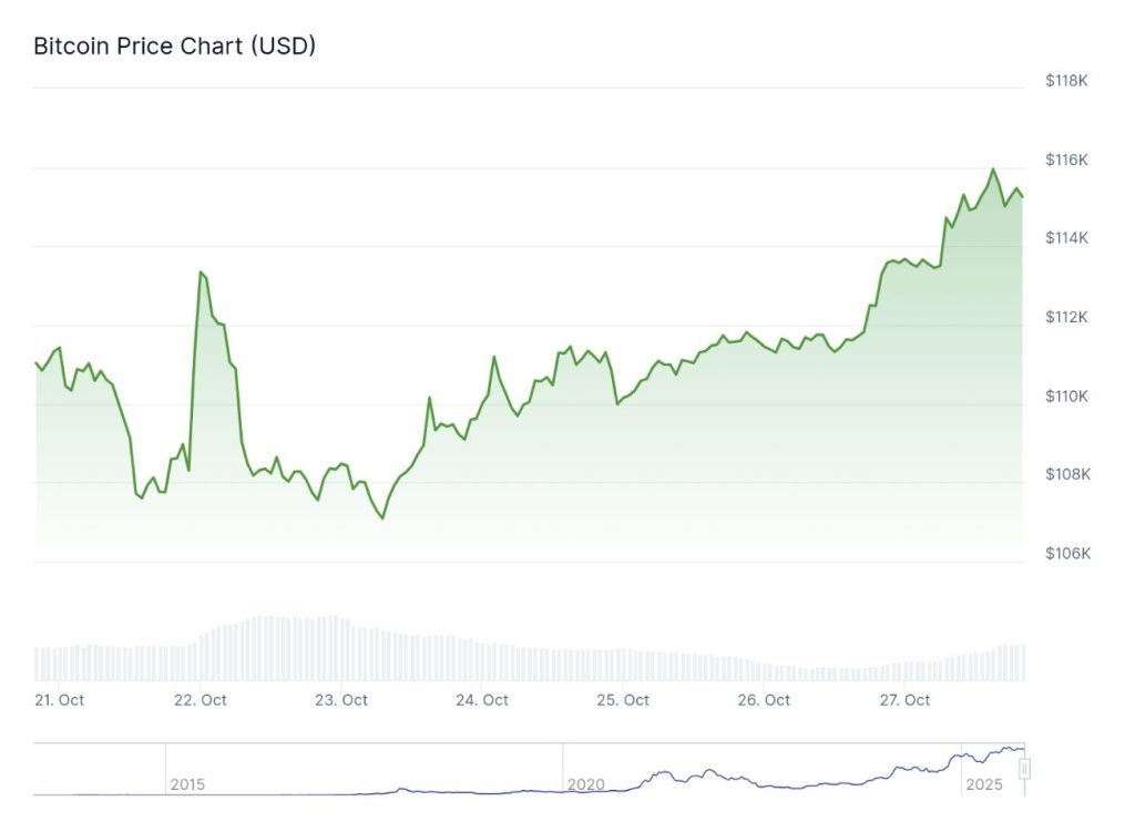 Après avoir atteint un sommet historique de 126 000 $ plus tôt ce mois-ci, le Bitcoin a baissé et est tombé jusqu’à 104 000 $ qui est son plus bas récent. Mais lundi, le BTC a réussi à rebondir et a retrouvé le niveau des 116 000 $ pour la première fois depuis le 13 octobre 2025.