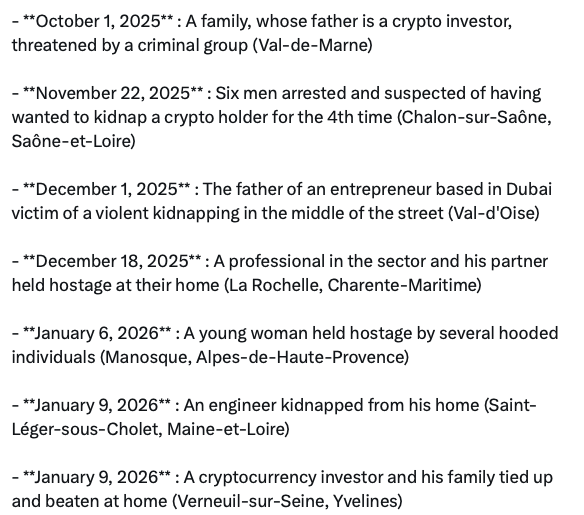 Le paradoxe est là : la France a structuré un cadre pour l’innovation financière, mais la sécurité physique devient un facteur de décision aussi important que la fiscalité ou la régulation. NFT Paris fut annulé pour 2026. Serait-ce une raison implicite sous couvert d’un marché peu florissant actuellement ? Un analyse, sur X, a publié les récentes attaques (liste non exhaustive n’incluant par les dernières tentatives).