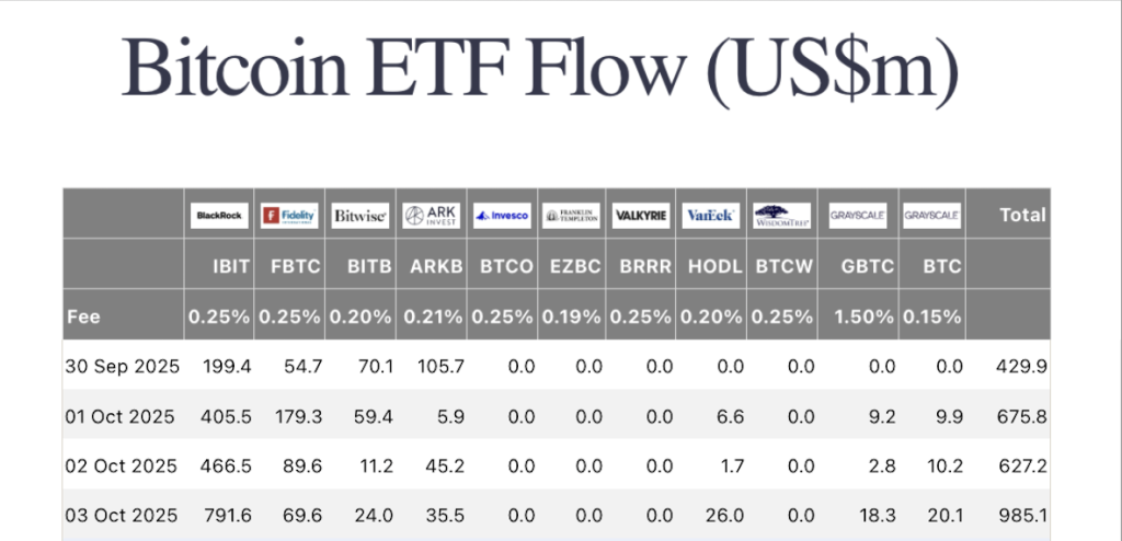 Les chiffre sont impressionnants. Entre le 30 septembre et le 3 octobre 2025, les ETF Bitcoin spot ont capté 2,717 milliards $ d’entrées nettes. La journée du 3 octobre se distingue avec 985 millions $.