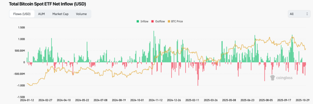 Après une longue période dans le vert, place au calme et la vente ? D’après Coinglass, ces derniers jours dans le rouge, certaines journées atteignant des sorties nettes dépassant les 500 millions de dollars. Cela explique en partie le ralentissement de la hausse et la pression vendeuse sur bitcoin.
