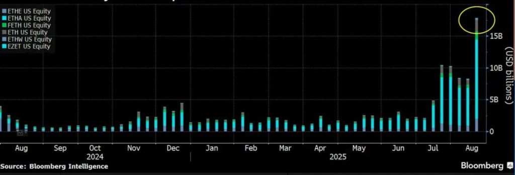 Mais les ETF sur l’Ether connaissent depuis peu, un réveil spectaculaire. Ils ont généré près de 17 milliards de dollars de volume hebdomadaire. Un nouveau record 7 milliards plus important que le précédent de 10 milliards établi en juillet 2025.