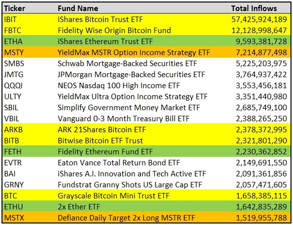 Ce basculement se lit aussi dans la diversité des produits : 5 ETF Bitcoin spot, 2 ETF Ethereum spot, 2 ETF liés à MicroStrategy (MSTR) et même un ETF Ethereum à effet de levier figurent parmi les meilleures performances depuis leur lancement.