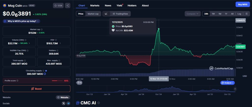 $MOG a repris la trend, avec un chat en mascotte, et pèse aujourd’hui autour de 150 millions de dollars et se balade dans le top 300 mondial. Rien d’extraordinaire en apparence, sauf qu’il garde des volumes étonnamment solides pour un token aussi jeune et aussi « meme ». Et c’est justement cette puissance virale qui intrigue Wall Street :