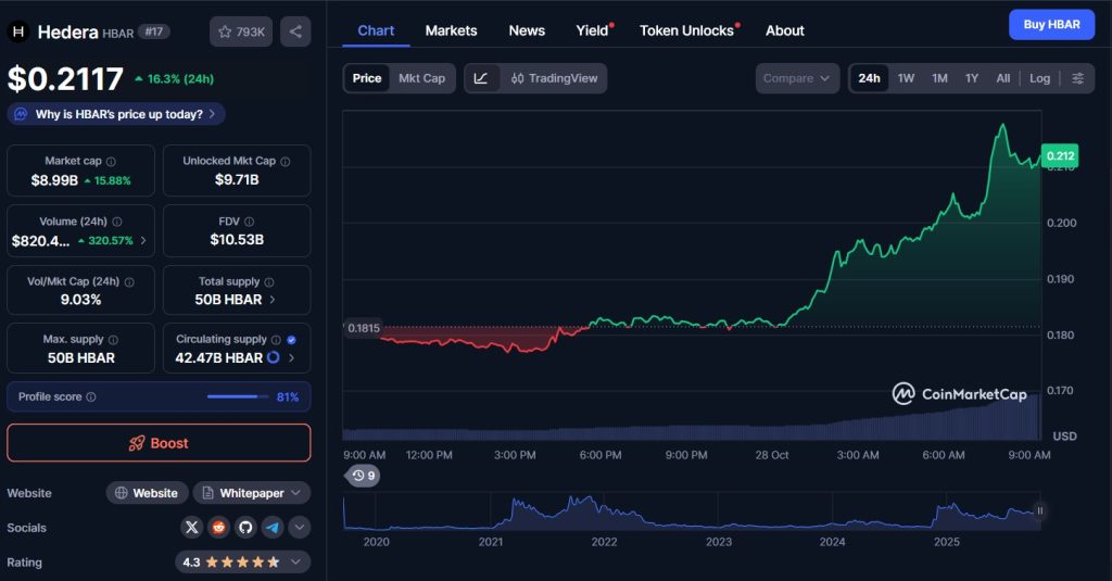 Hedera (HBAR) signe l’une des plus belles hausses du jour avec un bond de plus de 16 % suite à l’annonce de son ETF sur le Nasdaq. Portée par des partenaires de poids comme Google et IBM, la blockchain sort enfin de l’ombre et attire l’attention.