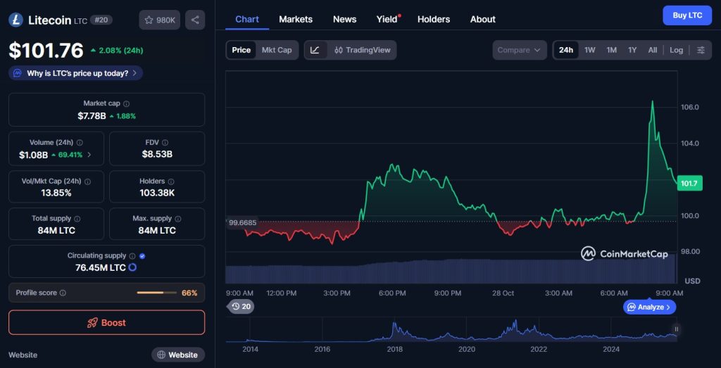 Litecoin (LTC) reprend vie avec une belle hausse d’intérêt. Son prix tourne autour des 101 $, et les volumes ont grimpé de 70 % en 24 h. L’arrivée de son ETF spot lui donne un coup de boost et renforce sa crédibilité auprès des investisseurs. À court terme, les analystes visent les 110 à 130 $, et certains voient même un retour vers 170 $ si le marché repart. Mais face aux nouvelles blockchains plus modernes, Litecoin devra prouver qu’il a encore sa place, surtout dans les paiements.