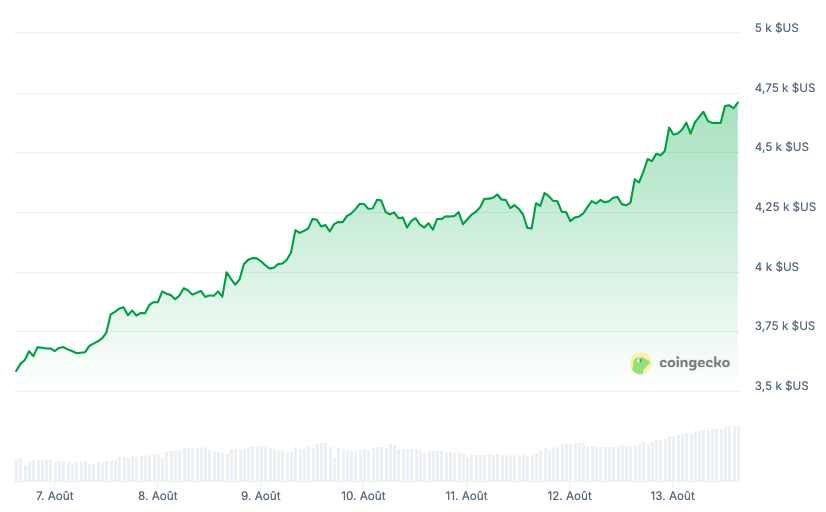 Ethereum reprend la lumière. Alors que la cryptomonnaie évolue autour de 4 400 dollars début septembre 2025, plusieurs signaux laissent penser qu’elle pourrait connaître une nouvelle envolée d’ici à la fin de l’année.