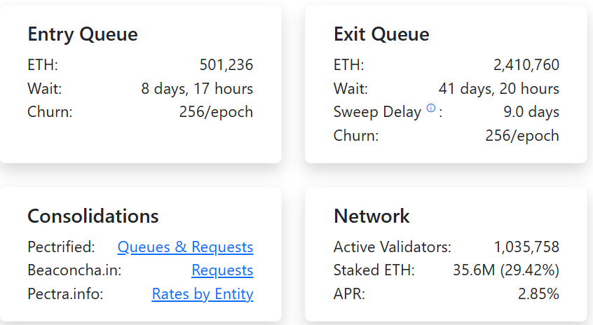 Le réseau Ethereum connaît actuellement son plus grand mouvement de sortie depuis la transition vers le Proof of Stake. Plus de 2,4 millions d’ETH, soit plus de 10 milliards de dollars, sont désormais en file d’attente pour être retirés. Une situation inédite qui porte le délai de sortie des validateurs à plus de 41 jours et 21 heures. Cette vague de retrait massif soulève naturellement des inquiétudes. Mais contrairement à ce que certains craignent, cela ne signifie pas un exode désordonné.