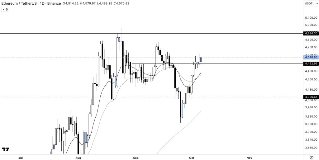 La seconde cryptomonnaie du marché a amorcé, en ce début du mois d’octobre, un léger rebond. Oscillant actuellement autour des 4 500 dollars, la formation de nouveaux sommets n’est qu’une question de temps ? Faisons un point sur la situation de l’actif, le scénario le plus favorable et les niveaux à surveiller activement durant les prochains mois.
