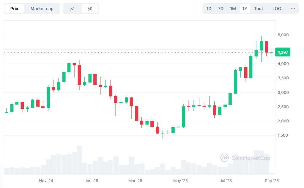 Plusieurs experts partagent un même constat : si Ethereum devait connaître une correction en septembre, celle-ci resterait probablement temporaire. Johnny Woo, par exemple, anticipe une descente vers les 3 350 $, mais il estime qu’un rebond pourrait s’amorcer dès octobre, avec à la clé un nouveau sommet historique. De son côté, Crypto Rover rappelle l’épisode d’avril 2025 où ETH avait brièvement chuté jusqu’à 3 250 $ avant de repartir à la hausse avec des volumes de trading multipliés par 2,5. Ces précédents renforcent l’idée qu’un éventuel recul actuel ne serait qu’un piège baissier destiné à secouer les investisseurs trop impatients.
