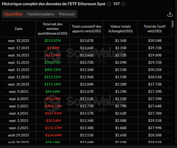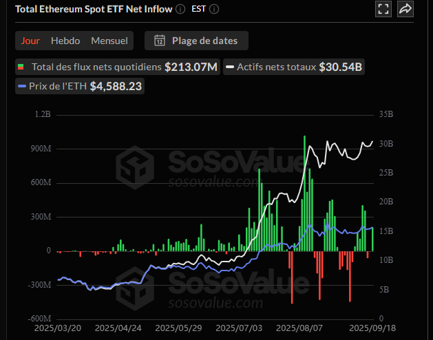Depuis le lancement des ETF crypto, le Bitcoin a presque toujours donné le ton général des flux d’investissement. Mais ce 18 septembre, le rapport de force s’est inversé. Les ETF Ethereum ont enregistré 213,07 M$ d’entrées nettes, dépassant largement les 163,03 M$ captés par les ETF Bitcoin. C’est la première fois depuis plusieurs semaines que l’Ether prend ainsi l’ascendant. Pour les investisseurs, c’est le signal d’une réorganisation particulière.