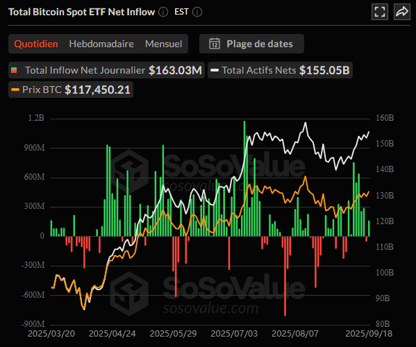 Les actifs nets s’élèvent à 155,05 Md $, soit 6,62 % de la capitalisation du BTC. Un poids encore considérable, mais qui montre un léger tassement de la dynamique.