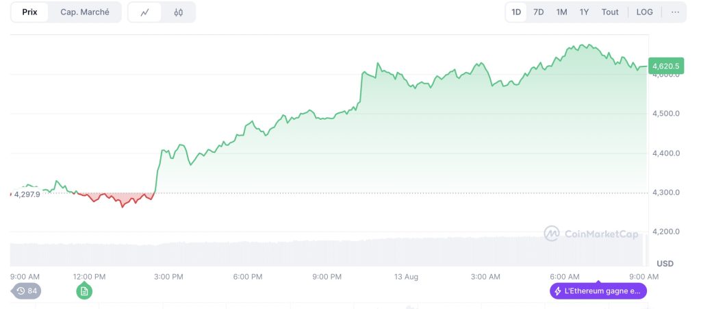 Ethereum en plein rallye : +8% en 24h, au-delà des 4 600$