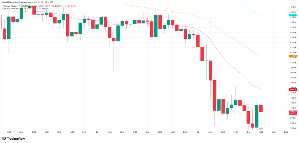 Le prix de l’ETH a cassé les supports au-dessus de 4 100 $ et a plongé vers la zone des 3 980 – 3 990 $. En fait, toutes les moyennes mobiles (20/50/100/200) sont au-dessus du cours, confirmant la pression vendeuse.