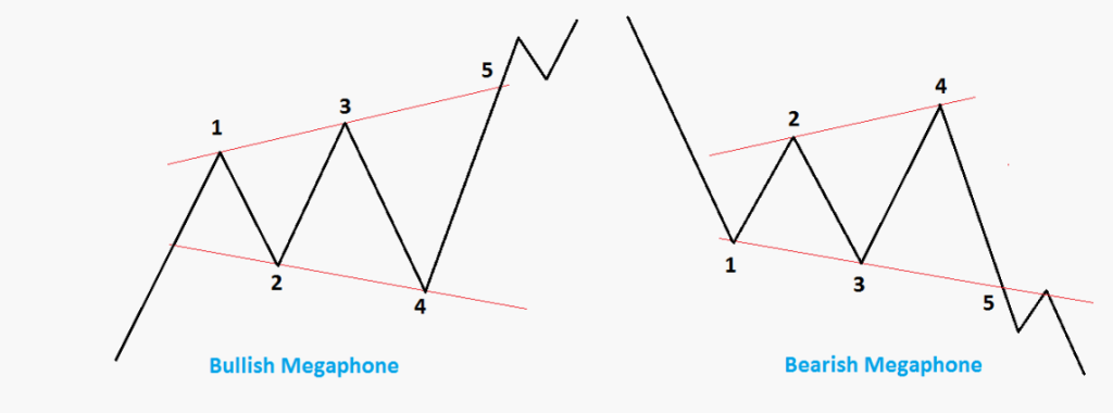 Un megaphone pattern, aussi appelé broadening formation, se traduit par une série d’oscillations qui s’élargissent progressivement : des sommets de plus en plus hauts et des creux de plus en plus bas. Cette configuration reflète une hausse de la volatilité, un marché où acheteurs et vendeurs se livrent une véritable bataille.