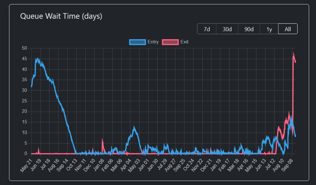 Le système d’Ethereum repose sur une file d’attente automatique. Quand un validateur veut quitter le staking, il ne sort pas immédiatement : il entre dans une queue. Et cette file grandit… surtout quand le marché est instable ou quand beaucoup de gens veulent sortir en même temps.