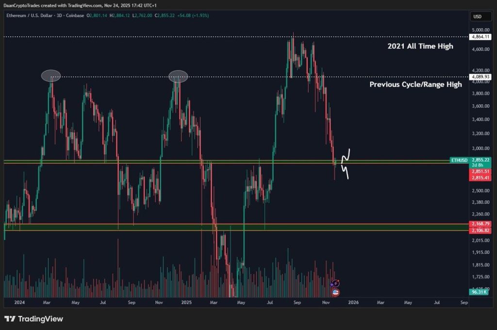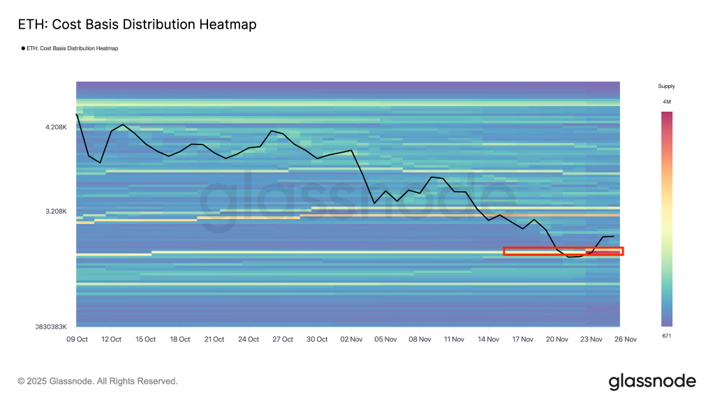 Glassnode montre qu’environ 4,95 millions d’ETH ont été achetés dans la zone 2 800$ – 2 830$. C’est énorme. Un tel regroupement crée un véritable plancher de marché, car les investisseurs qui ont accumulé là défendent souvent leur position.