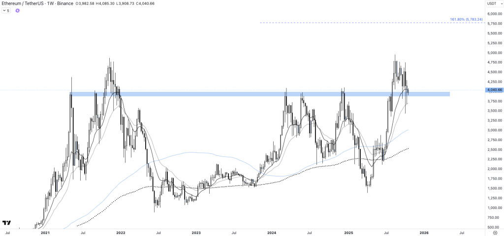 Pour la première fois depuis octobre 2021, ethereum parvient à se maintenir au-delà des 4 000 dollars à l’échelle hebdomadaire. En franchissant cette zone de résistance, désormais en confluence avec l’EMA13, la situation ressemble comme deux gouttes d’eau au précédent cycle haussier.