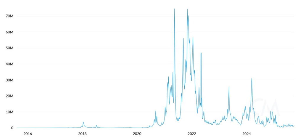 Il est indéniable que Ethereum tient une place importante dans la montée en puissance des stablecoins et de la tokenisation d’actifs du monde réel (RWA). Pour Tom Lee, le pic d’activité du réseau Ethereum devrait se traduire par une augmentation de ses revenus (frais de transaction). Pourtant, les données disponibles racontent une toute autre histoire.