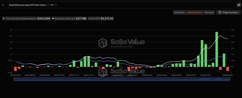 Les ETFs Ethereum ont enregistré des entrées nettes de plus de 1,2 milliard $ au mois d’août, propulsant l’actif face à un contexte volatil. En juillet, les flux spot ETF ont grimpé à 5,43 milliards $, ce qui souligne l’ampleur de l’investissement institutionnel.