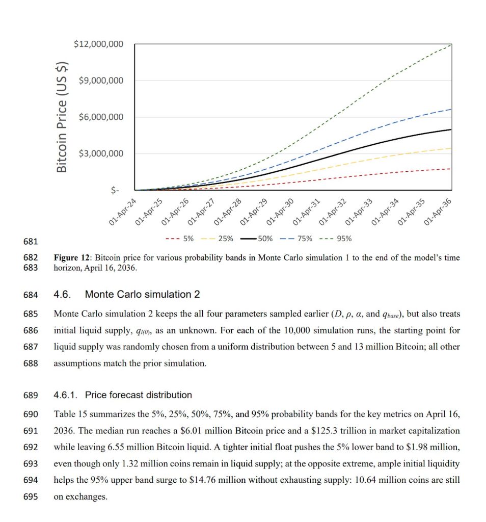 Le modèle combine les courbes d’adoption macroéconomiques avec les événements de liquidité microstructurels. Il emploie le modèle Monte Carlo ainsi que la spécification Epstein-Zin pour modéliser la variation du prix du Bitcoin dans divers scénarios. Une façon de dépasser les modèles simplistes et d’offrir une vision plus complète.