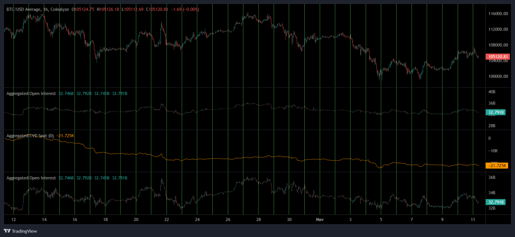En regardant Bitcoin sur les derniers jours (timeframe 1h, données Coinalyze), on observe effectivement des moments où la session européenne soutient les prix. Le CVD spot remonte souvent entre 7h et 15h UTC, ce qui signifie que les ordres d’achat au marché prennent le dessus. À l’inverse, la session US (13h–21h UTC) montre plusieurs phases de repli ou de prise de profits.