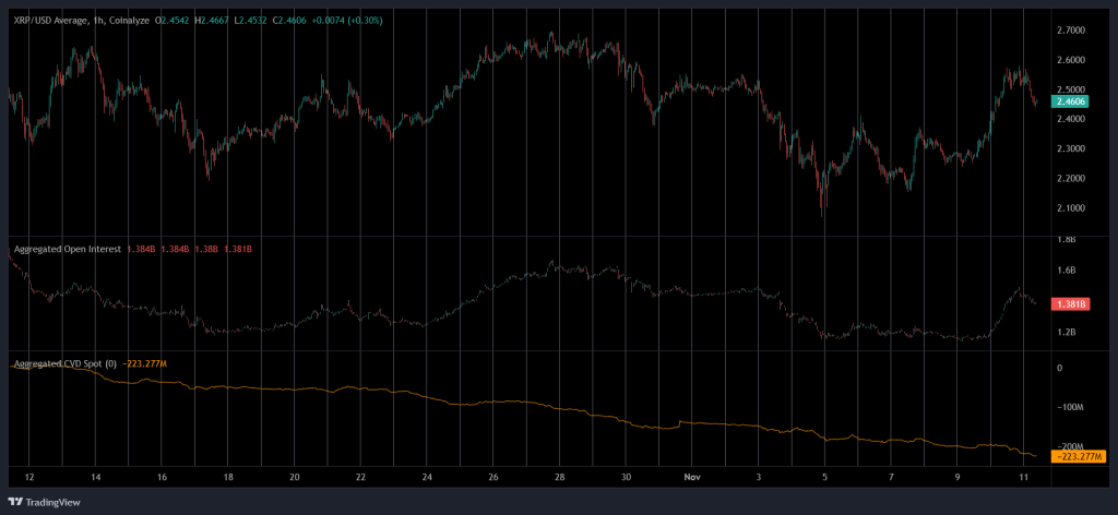 Même constat sur XRP, mais dans l’autre sens : le CVD est en chute libre toute la semaine, signe d’une vente continue au marché. Pas de “Europe achète” ou “US vend”, juste une tendance baissière globale.