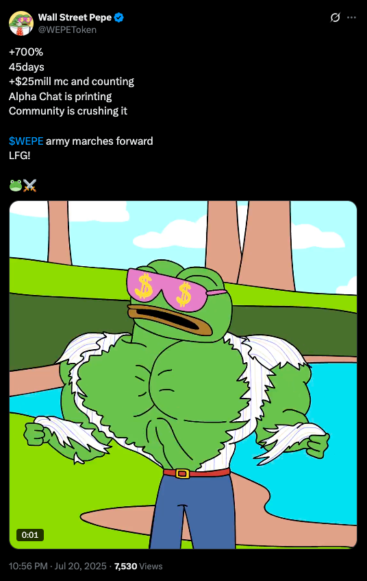 Wall Street Pepe ($WEPE), le mème coin phénomène issu de la fusion audacieuse entre l’univers de Wall Street et de celui de Pepe the Frog, a enregistré une hausse spectaculaire de 600 % depuis le 1er juin, et de 75 % depuis le 1er juillet.