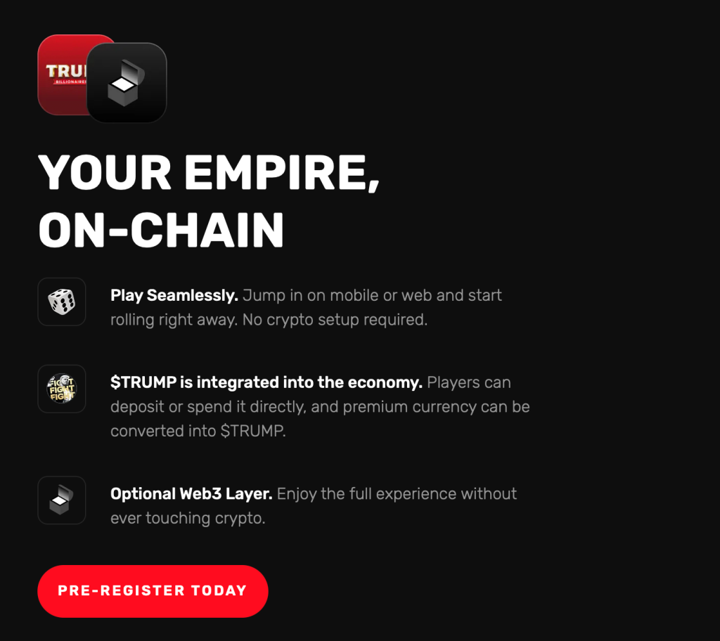 Un post du compte X TrumpMeme a récemment annoncé l’ouverture des préinscriptions pour un jeu officiel sous licence Trump. Baptisé Trump Billionaires Club, le site présente Trump dans un rôle façon « The Apprentice », avec un gameplay centré sur des lancers de dés, l’acquisition de propriétés et des placements en bourse (curieusement, sans crypto).