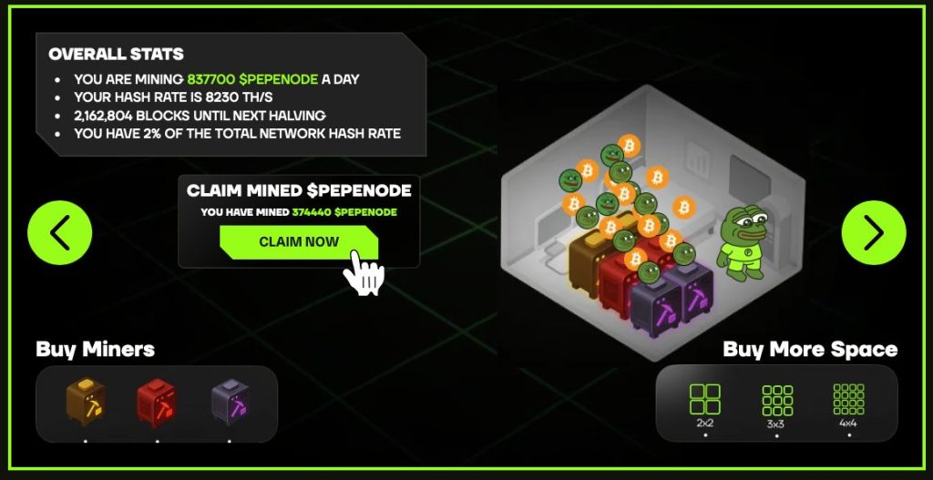 PepeNode (PEPENODE), à l’inverse, fait le pari opposé : un jeu 100 % natif Web3, où la blockchain est l’ossature même du système. Et plutôt que de recycler les modèles Play-to-Earn bancals qui ont explosé puis ont chuté, comme Axie, StepN et les jeux Telegram de l’an dernier, PepeNode introduit le premier modèle de mine-to-earn de l’univers des memecoins, pensé pour durer.