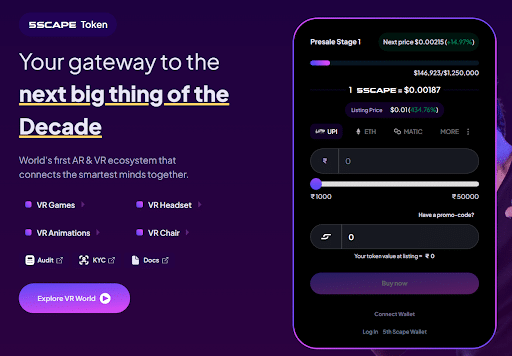La prévente de 5thScape offre 80 % de cette offre totale, avec un objectif de collecte de fonds allant jusqu’à 15 millions de dollars. La prévente se déroule en 12 étapes. Le prix du jeton est fixé à 0,001 87 $ pour l’étape actuelle et à 0,008 7 $ pour la douzième étape. Le prix d’inscription est fixé à 0,01 $. Jusqu’à présent, plus de 146 000 dollars ont été collectés.
