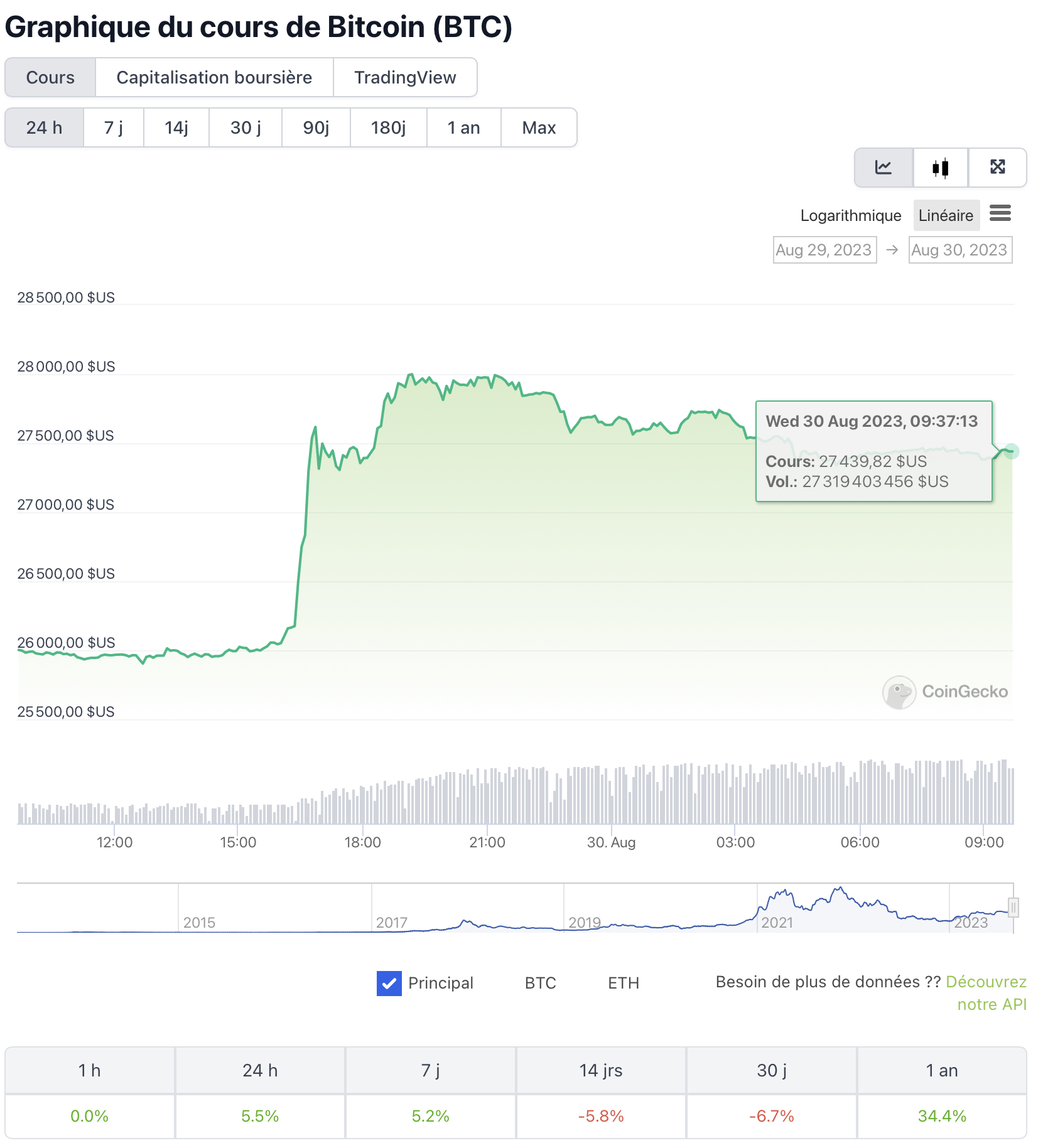 La nouvelle de la victoire de Grayscale a eu un impact immédiat sur les marchés des cryptomonnaies. Le prix du Bitcoin a connu une hausse significative, dépassant les 27 000 dollars et atteignant même brièvement les 28 000 dollars.