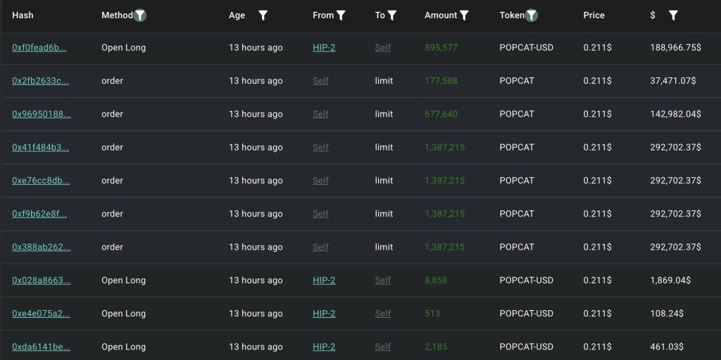 Dans la foulée, un nouvel ordre d’achat de 20 millions de dollars a été placé à 0,21 dollar pour simuler une forte demande sur POPCAT. Annulant les ordres juste après, la créance a été transmise au HLP. Mais avec l’effondrement de la liquidité ayant eu lieu, cela a forcé le HLP à absorber les positions.