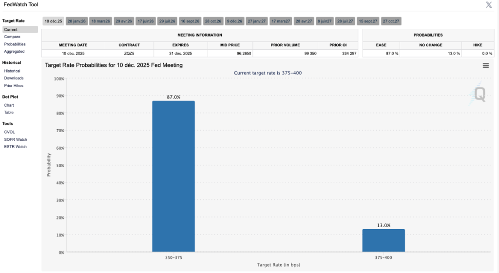 À l’approche du FOMC du 10 décembre, durant lequel une nouvelle baisse des taux devrait avoir lieu, beaucoup se tourneront vers le discours qui aura lieu à 20h00 sur le fuseau horaire français. Malgré la fin du QT, nous n’avons aucune informations sur une reprise imminente du QE, le moment le plus attendue par les investisseurs en raison de l’impact que cela aurait sur les marchés financiers.
