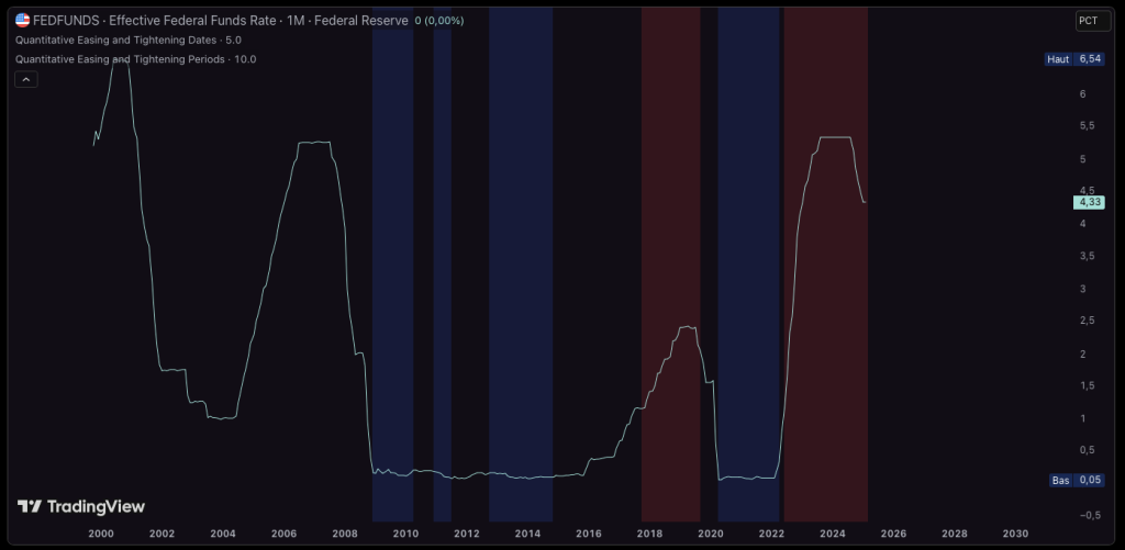 Le graphique ci-dessus porte sur la timeline des périodes de QE et de QT par la FED. Nous pouvons effectivement constater que nous nous apprêtons à sortir d’une période de resserrement monétaire, ce qui risque d’influencer drastiquement les cryptomonnaies