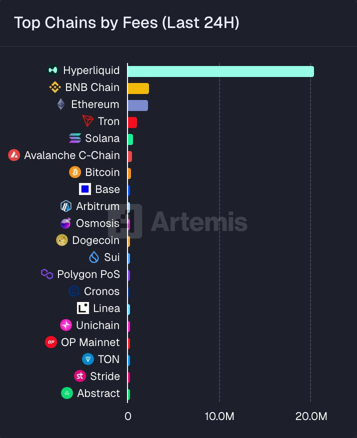 Sur les 24 dernières heures, Hyperliquid domine très clairement l’industrie crypto en générant plus de 20 millions de dollars de frais, ce qui surpasse très clairement les statistiques sur la BNB Chain et Ethereum.