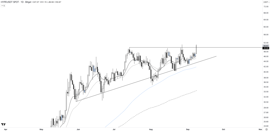 Hyperliquid est proche d’un nouvel ATH en repassant à plus de 50 dollars. Est-il capable de décoller vers de nouveaux sommets ? Avec un vote en approche sur le déploiement de son stablecoin, la volatilité fait son retour. Est-ce le moment tant attendu pour que le projet puisse définitivement s’inscrire à la dixième position sur coinmarketcap ?