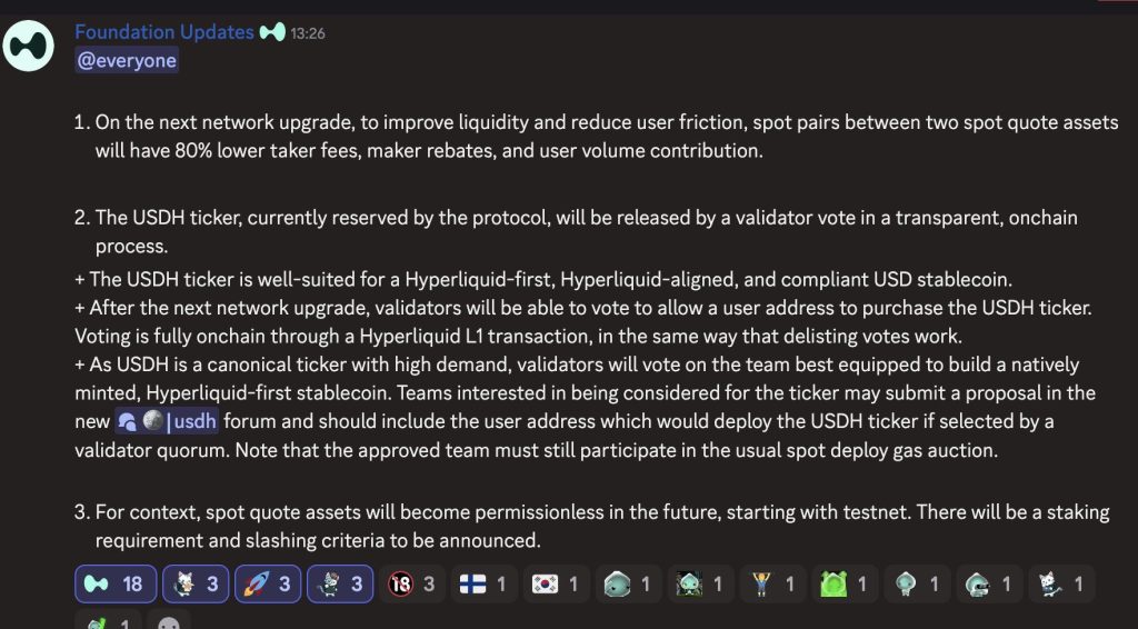 Sur Hyperliquid, plus de 95 % du volume d’échange est réalisé avec de l’USDC. Toutefois, l’équipe souhaite réduire l’exposition et la dépendance de l’écosystème au stablecoin de Circle. Pour cela, le lancement du stablecoin Hyperliquid (USDH) est programmé pour bientôt. Cependant, les validateurs doivent se prononcer sur ce sujet avant d’amorcer son intégration. Les fondateurs ne se prononceront pas lors du vote.