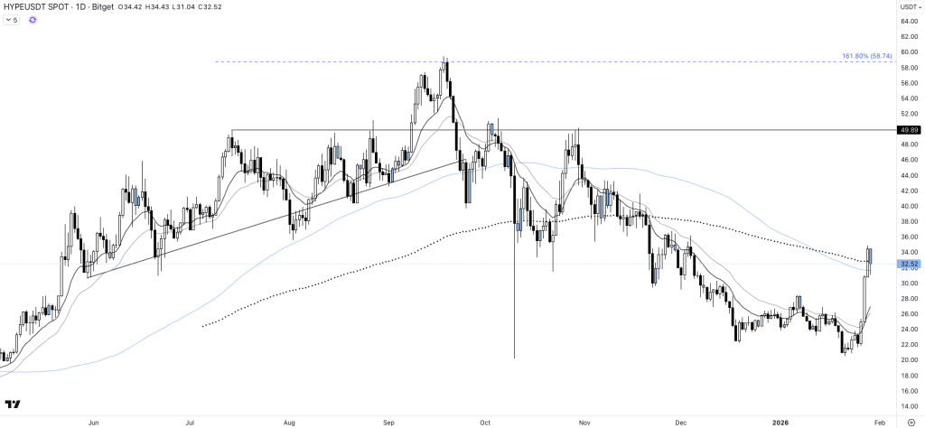 Pour autant, parler d’ATH imminent demande de regarder les ordres de grandeur. Les données de marché situent HYPE autour de 32,76 $, alors que le précédent sommet se positionne autour des 60 dollars. Il faudrait donc un mouvement d’environ +80 % pour un nouveau record, ce qui n’est pas impossible en crypto, mais rarement solitaire et isolé des autres actifs.