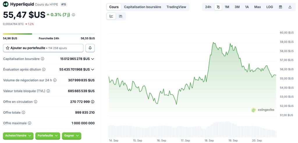 Si le support à 50 $ tient, le scénario optimiste verrait HYPE grimper à nouveau vers les résistances de 65, voire 70 $. Ce chemin nécessite plusieurs facteurs. Notamment des flux entrants et un volume qui grandissent, et un sentiment global favorable sur les marchés crypto. La cassure d’un seuil de résistance clair pourrait attirer de nouveaux acheteurs et ainsi renforcer le momentum.