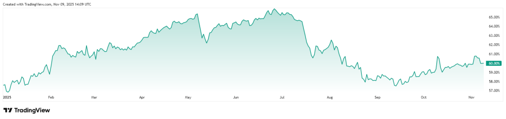 Le Bitcoin représente aujourd’hui 60 % de la capitalisation totale du marché crypto, contre plus de 65 % il y a six mois. Cette baisse peut sembler minime, mais elle traduit un vrai mouvement : celui d’un rééquilibrage progressif des flux vers d’autres tokens.