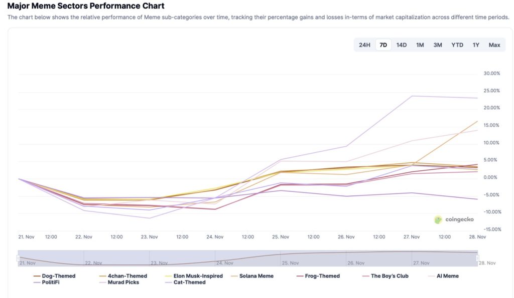 Au cours des sept derniers jours, plusieurs segments du marché des mème coins ont fortement progressé. Ils ont affiché des hausses entre 10 % et 25 % dans des catégories comme les jetons inspirés par Elon Musk, les mème coins basés sur Solana et les mème coins choisis par Murad.