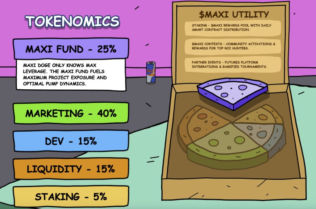 C’est pour cela que Maxi Doge a la forme d’une mascotte hyper-massive de 120 kilos de muscles. Il incarne l’effort pour atteindre le sommet. Le tokénomie du projet alimente d’ailleurs cette même ambition.