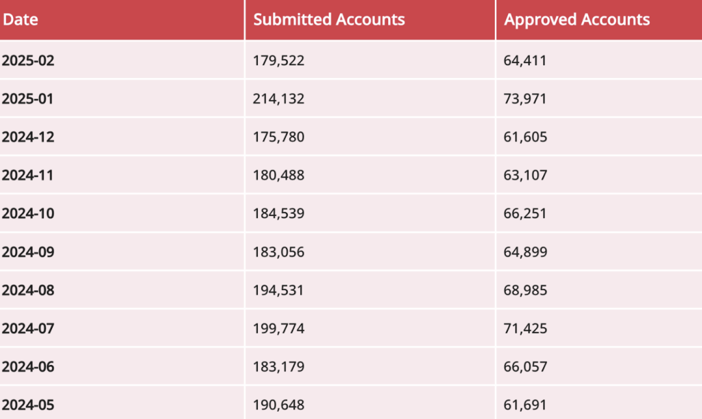 OnlyFans compterait plus de 3,5 millions de créateurs actifs. Les comptes soumis sont tombés à 170 000 en novembre 2024 et en février 2025, avec un pic à plus de 200 000 demandes en janvier 2025 entre les deux. Ce contraste pourrait être le signe d’une hésitation croissante chez les créateurs.