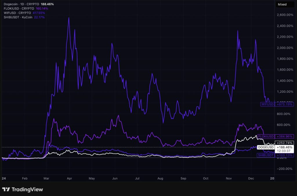 Ce que beaucoup ont appelé “supercycle des mème coins” s’est produit l’an dernier. Il y a eu des retombées jusqu’en 2025. De nouveaux jetons ont cependant éclipsé le DOGE et le SHIB. Des jetons comme le Floki (FLOKI) et le DogWifHat (WIF) leur ont carrément volé la vedette. Chacun d’eux a atteint de nouveaux sommets tandis que leurs “aînés” sont restés à la traîne.