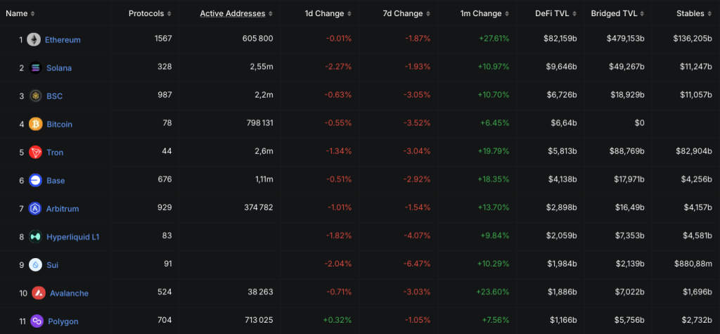 Sur l’écosystème ethereum, les Layer 2 reviennent en force sur ces 30 derniers jours. Ethereum connaît une hausse de 27 % de la liquidité présente sur la blockchain. Derrière, nous retrouvons des Layer 2 comme Base ou Arbitrum qui essuient respectivement une hausse de 18,30 et 13,70 %.