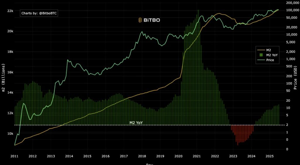 Historiquement, une baisse des taux entraîne une baisse du dollar. Et en règle générale, cela a eu tendance à faire monter le prix du Bitcoin. De son côté, l’agrégat monétaire M2 américain a souvent progressé en parallèle avec le prix du BTC. Cela souligne l’attrait du Bitcoin comme actif alternatif.