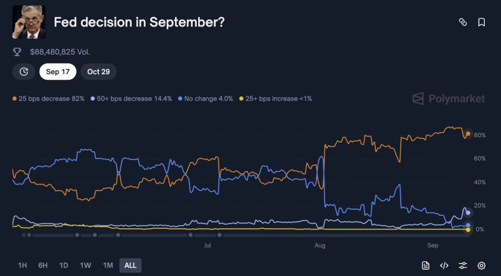 Le marché est désormais presque certain qu’une baisse des taux aura lieu lors de la réunion du Comité fédéral de l’open market (FOMC) les 17 et 18 septembre. Sur la plateforme de prédiction Polymarket, les parieurs penchent massivement vers une baisse de 25 points de base la semaine prochaine. Ils estiment qu’il existe 83 % de probabilité qu’il y ait une baisse contre seulement 4 % pour un statu quo. Dans ces marchés, le prix d’une part « Oui » reflète la probabilité implicite d’un résultat, avec 1 $ représentant la certitude.