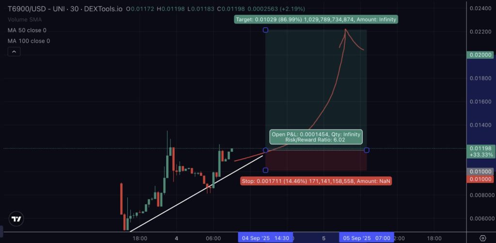 Quiconque a acheté du T6900 hier à son plus bas de 0,0049 $ réalise aujourd’hui une plus-value de 140 %.